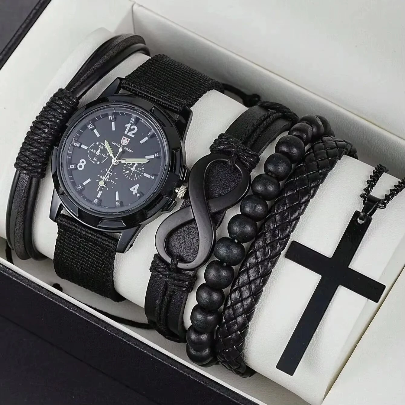 This coordinated men’s accessory set includes a mechanical-style wristwatch, a cross-pendant necklace, and multiple PU leather beaded bracelets — all designed in a sleek black finish for a bold, masculine look.