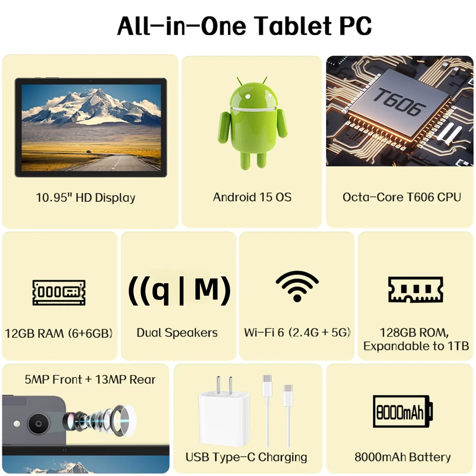 【Newest 2025 Android 15 Tablet with T606 8-core CPU】2025 New 10.95 Inch tablet is equipped with Android 15 system. Privacy permissions, personalization options and UI pages have been fully upgraded. Equipped with Octa-core T606, it can smoothly perform multi-tasking and split-screen collaboration, providing professional-level performance.