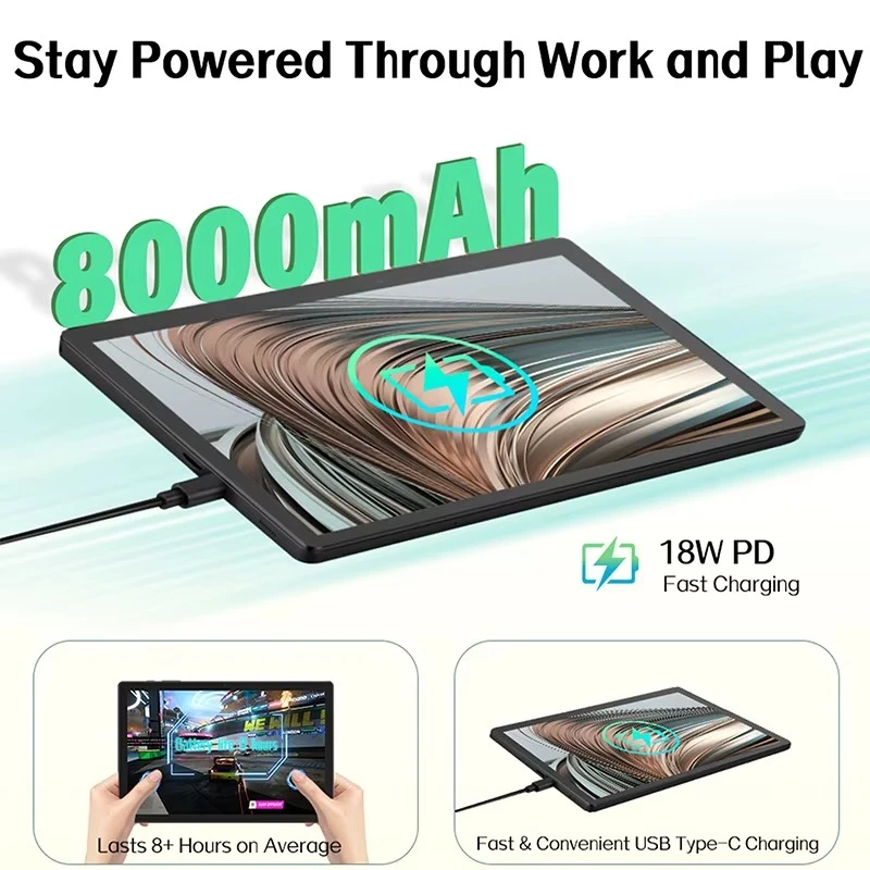 【8000mAh More Power Battery】The 128GB Android 15 Tablet is equipped with an 8000mAh large battery, which effectively reduces battery anxiety. After experimental testing, it can standby for more than 500 hours, browse the web for up to 12 hours, play videos for up to 10 hours, and play games for up to 8 hours. Watching movies, listening to music, and editing files for a long time have become easy.