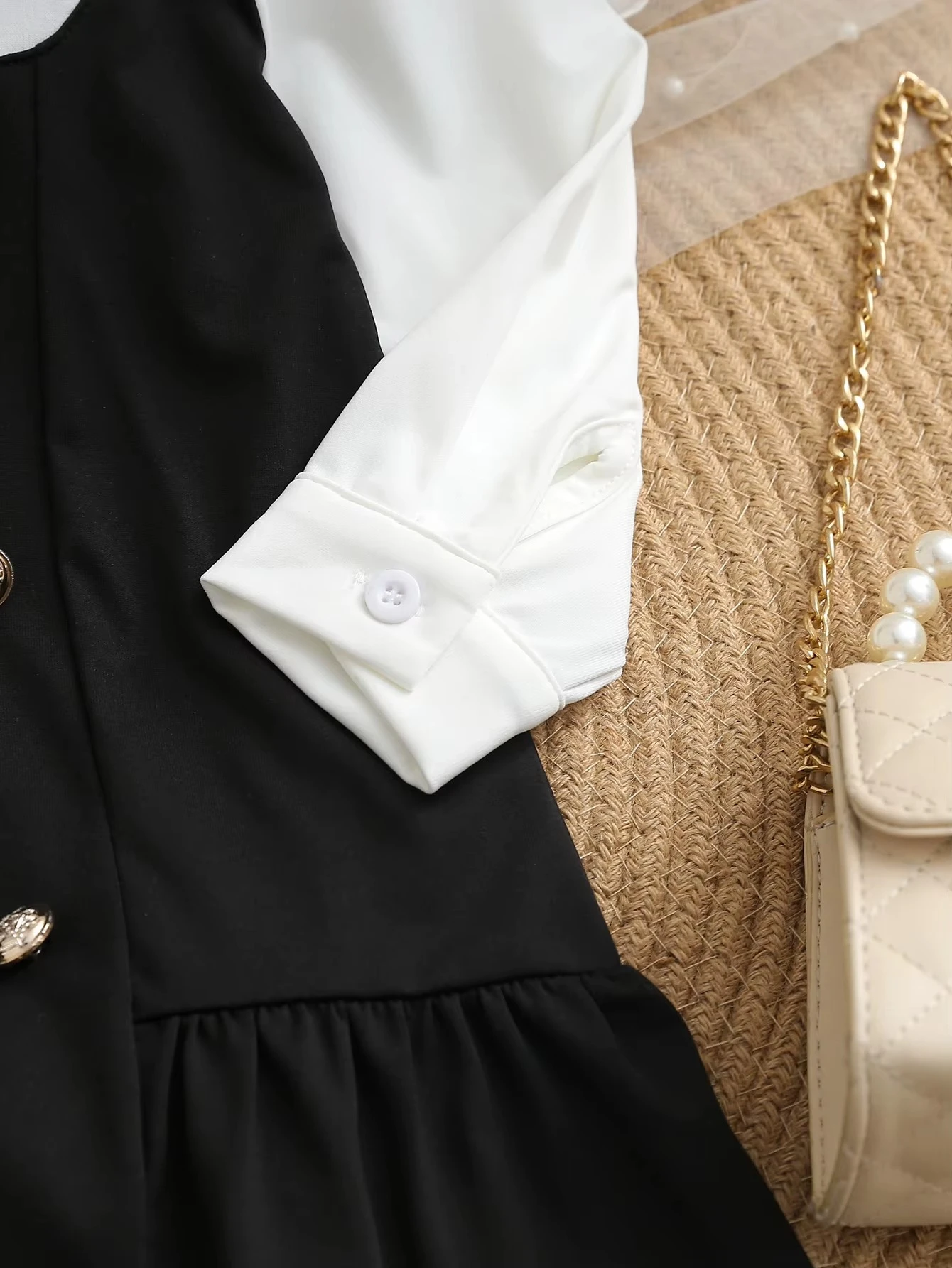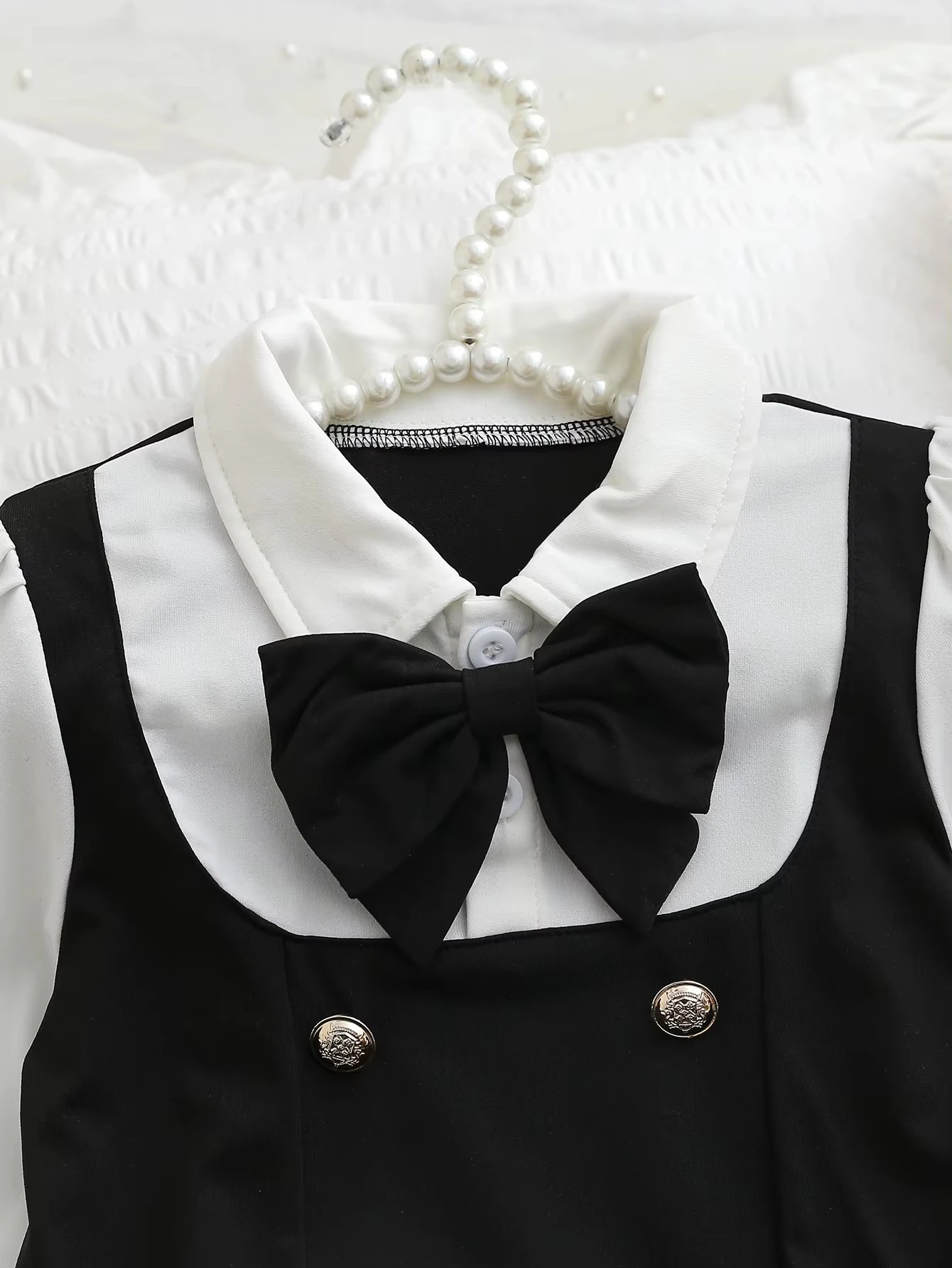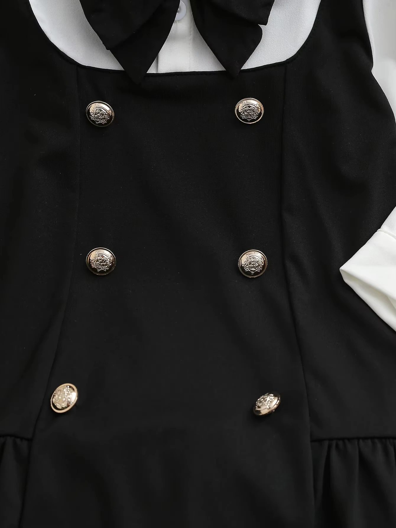 With its bowknot accent, patchwork color block design, button-down front, bishop sleeves, and collared neckline, this short fit-and-flare dress blends timeless elegance with playful flair.Autumn and Winter Girls' School Style Dress Black and White Contrasting Color Shirt Collar Three-Dimensional Bow Party Dress