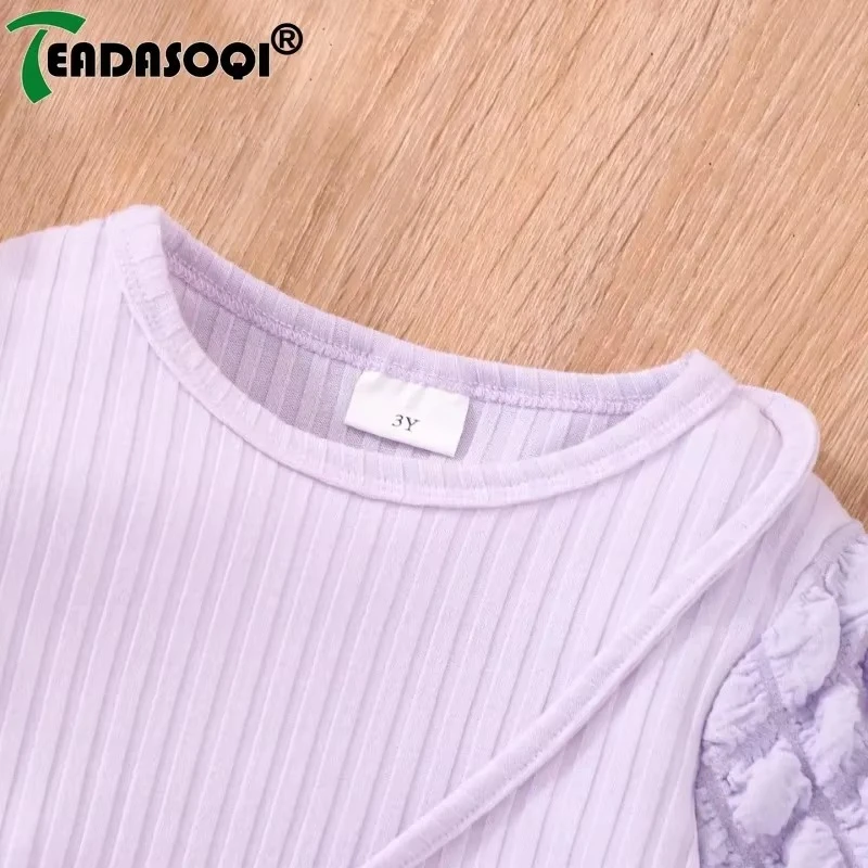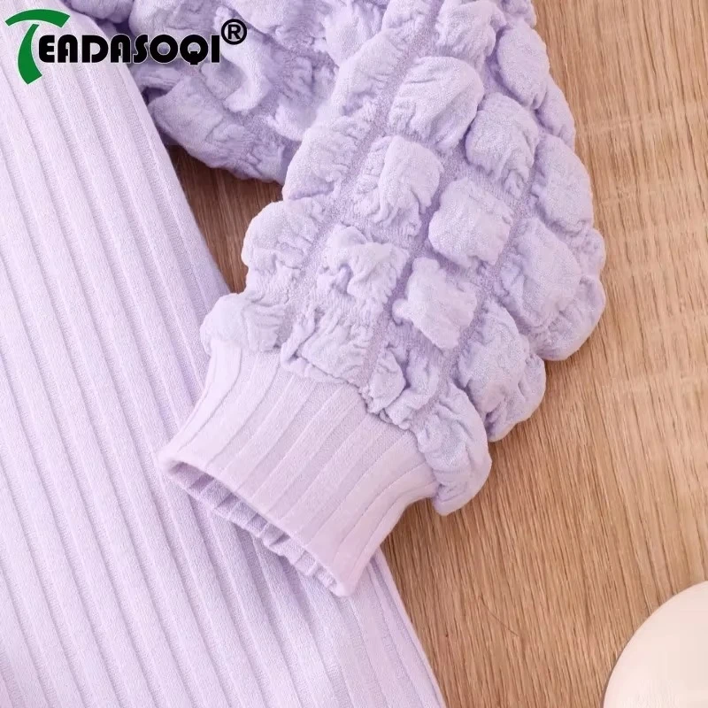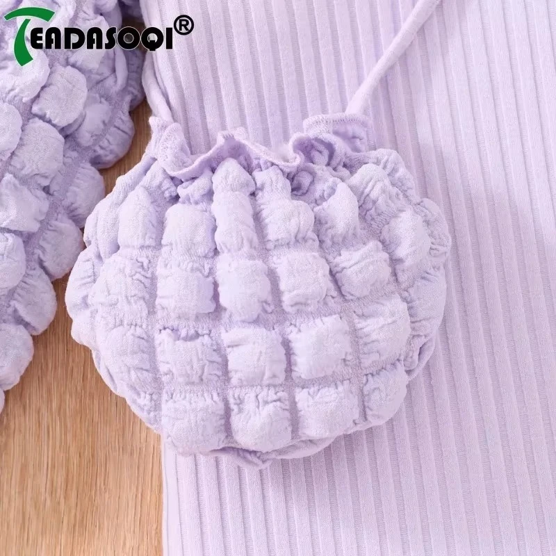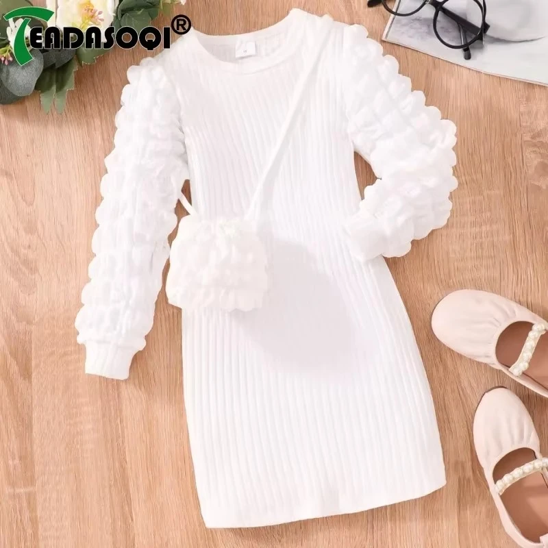 This adorable dress set features a solid color long-sleeve baby dress with puffy bubble sleeves and a ribbed pit texture, adding playful volume and charm. The matching mini bag completes the look, making it perfect for fashion-forward little girls.
