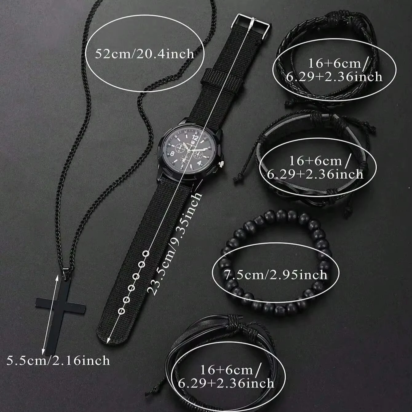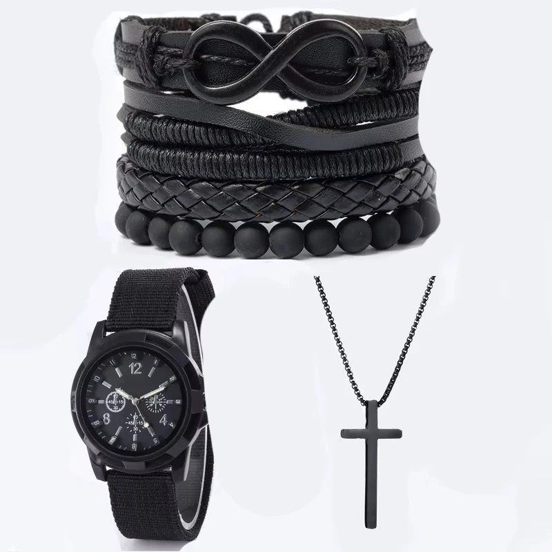 This coordinated men’s accessory set includes a mechanical-style wristwatch, a cross-pendant necklace, and multiple PU leather beaded bracelets — all designed in a sleek black finish for a bold, masculine look.
