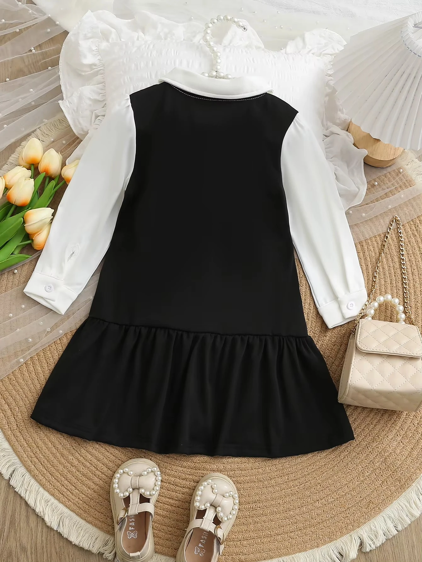 With its bowknot accent, patchwork color block design, button-down front, bishop sleeves, and collared neckline, this short fit-and-flare dress blends timeless elegance with playful flair.Autumn and Winter Girls' School Style Dress Black and White Contrasting Color Shirt Collar Three-Dimensional Bow Party Dress