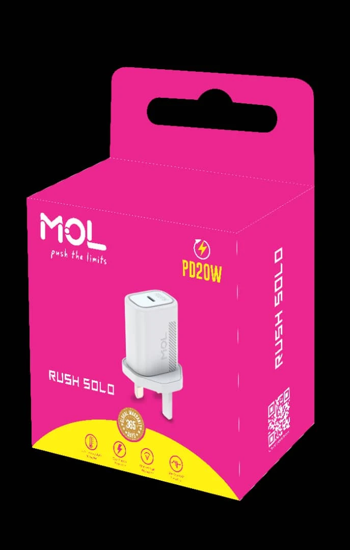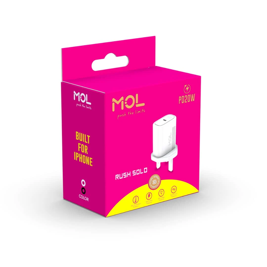 Experience lightning-fast charging with the MOL Rush Solo 3A PD20W Charger Head — built to power your moments instantly.
